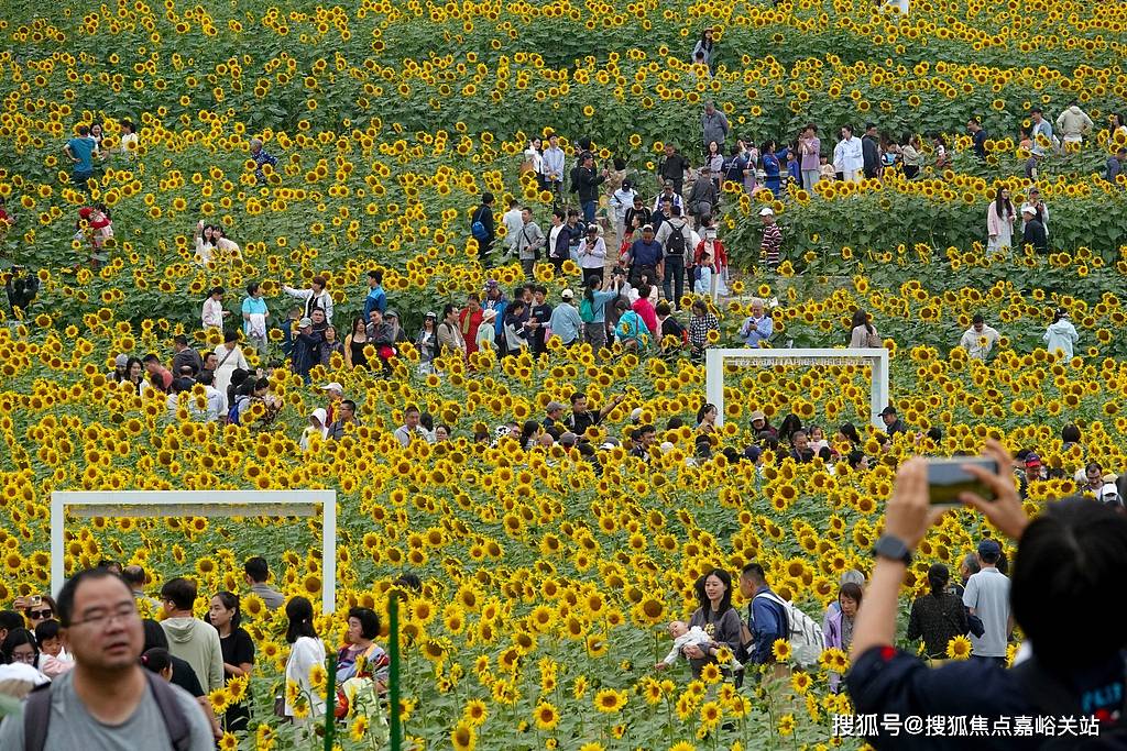 2025年10月3日,北京温榆河公园芸上梯田景区里的向日葵花盛开,吸引来众多游人前来观赏拍照。视觉中国 图