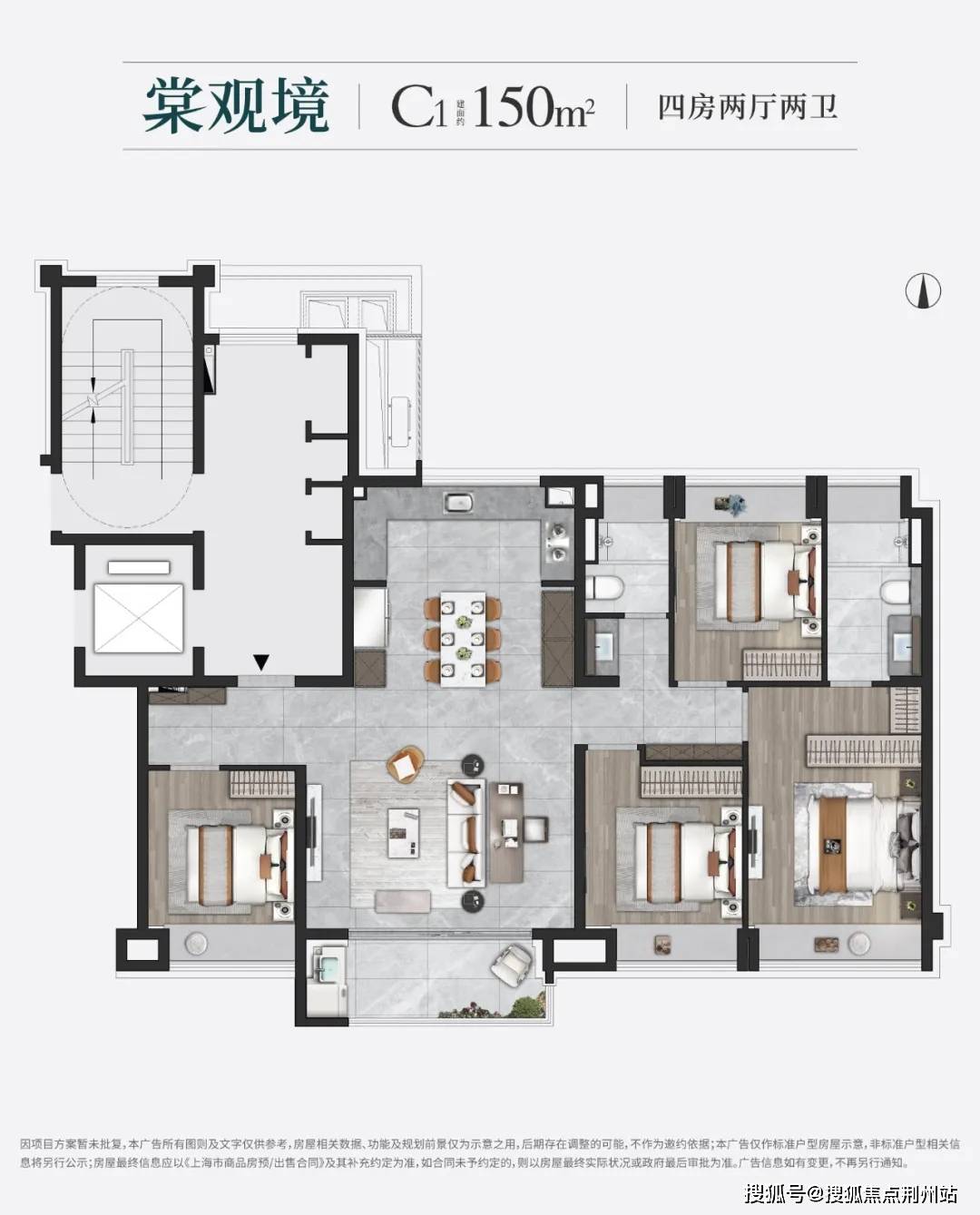 约150㎡4房2卫户型类一梯一户的居住体验,业主能独享一整个电梯厅,加上入户玄关的配置,私密性相当高。