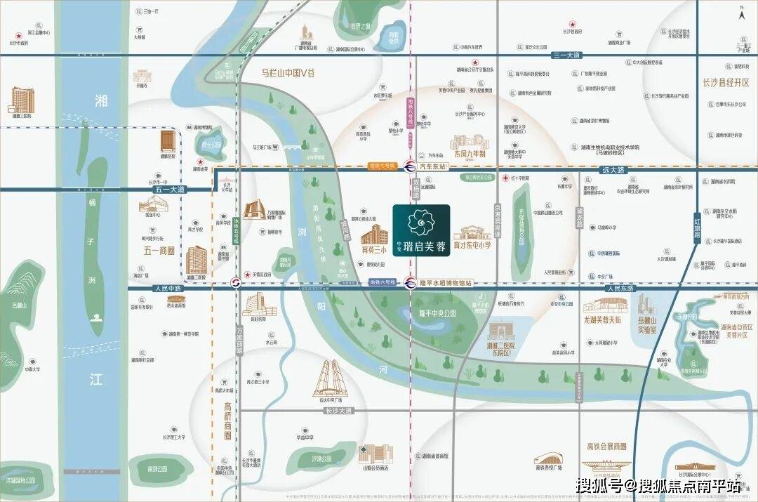 项目毗邻浏阳河,十里风光旖旎,艺术聚落依水而生,串联两百余亩隆平中央公园与东驿公园双园胜景,城市之心营造生态栖居范本。