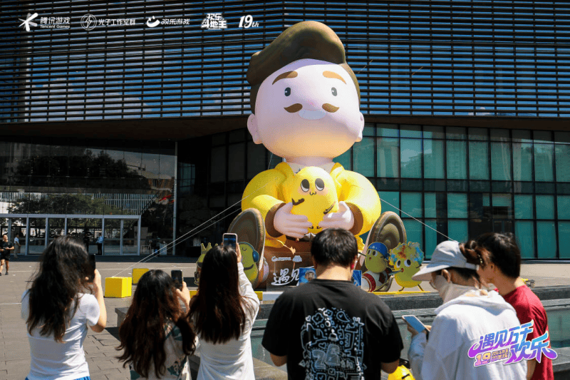 更亮眼的是,官方直接在腾讯滨海大厦来了波“高调”官宣,大厦前立起巨型的“地主抱欢乐豆”气模,夜晚更是有“欢乐斗地主,遇见万千欢乐”以及各种经典“游戏黑话”灯光秀,仪式感直接拉满。无数玩家也前来打卡拍照,这排面简直绝了!