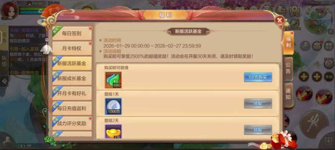 新服开启后1-30天,68元新服活跃基金,25倍超值返利,登录14天即可全部带回家;