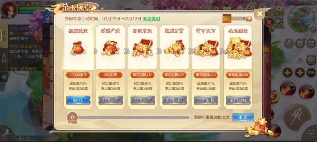制作礼包赢海量彩玉,失败可或锦缎,兑换橙色神器-炼神金炉(技能强化增伤)、铭文自选·极等珍品奖励。
