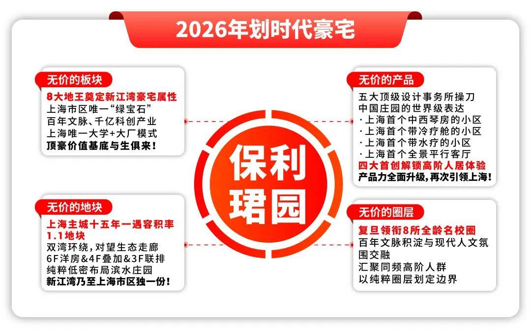 保利·珺园立于新江湾无价板块之上,以1.1主城罕见低密地块、双河环抱的生态天赋、四大上海首创的庄园级产品,以及全维顶配的生活配套,将世界顶豪的价值逻辑悉数兑现