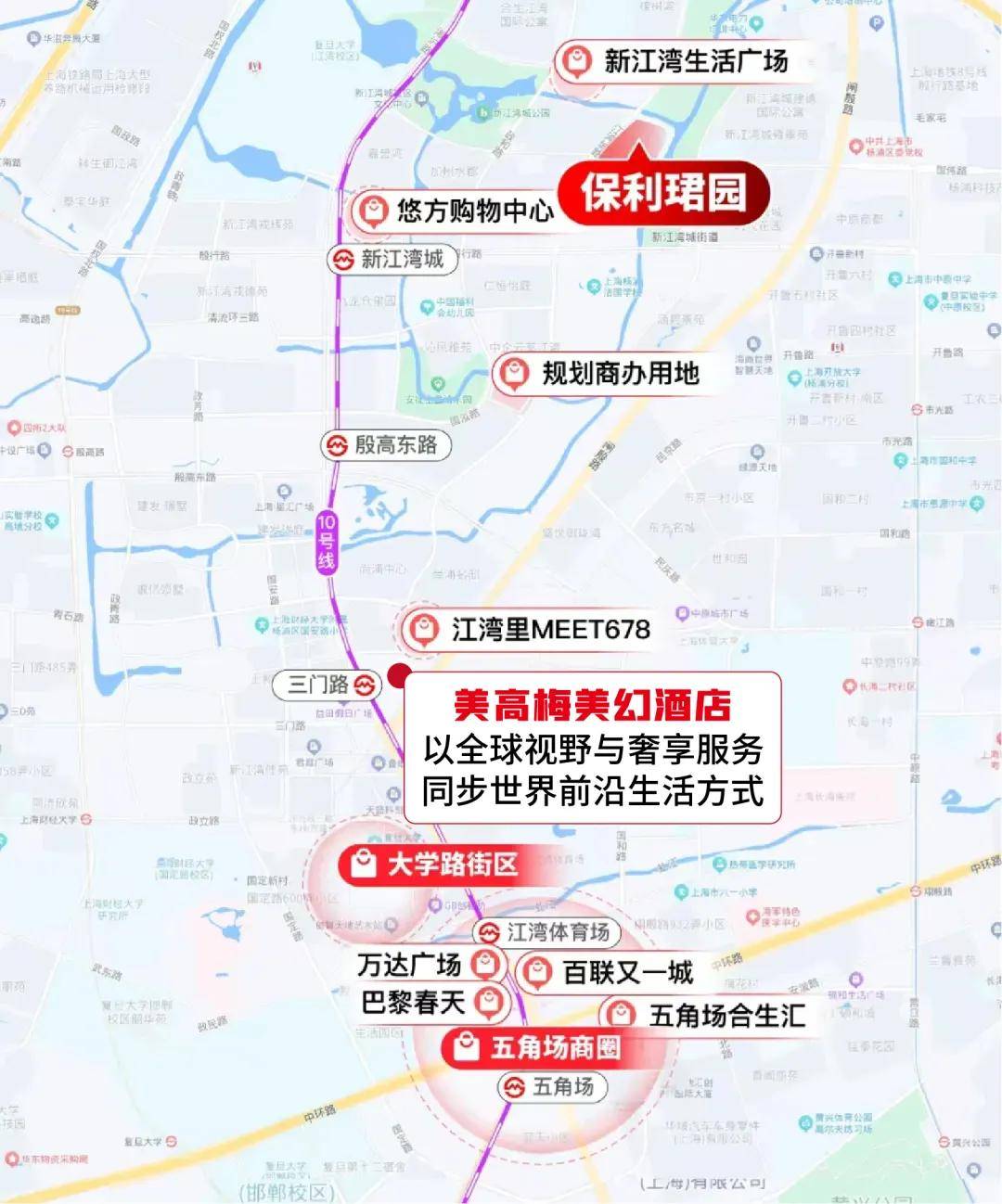 大学路、新江湾城生活广场五大摩登商圈,涵盖潮流购物、特色餐饮、亲子娱乐、高端消费等全业态,步行可达社区商业满足日常所需,无需远离低密静谧,即可拥抱城市繁华尤其是已经官宣入驻AXIOM云际尚浦的美高梅美幻酒店