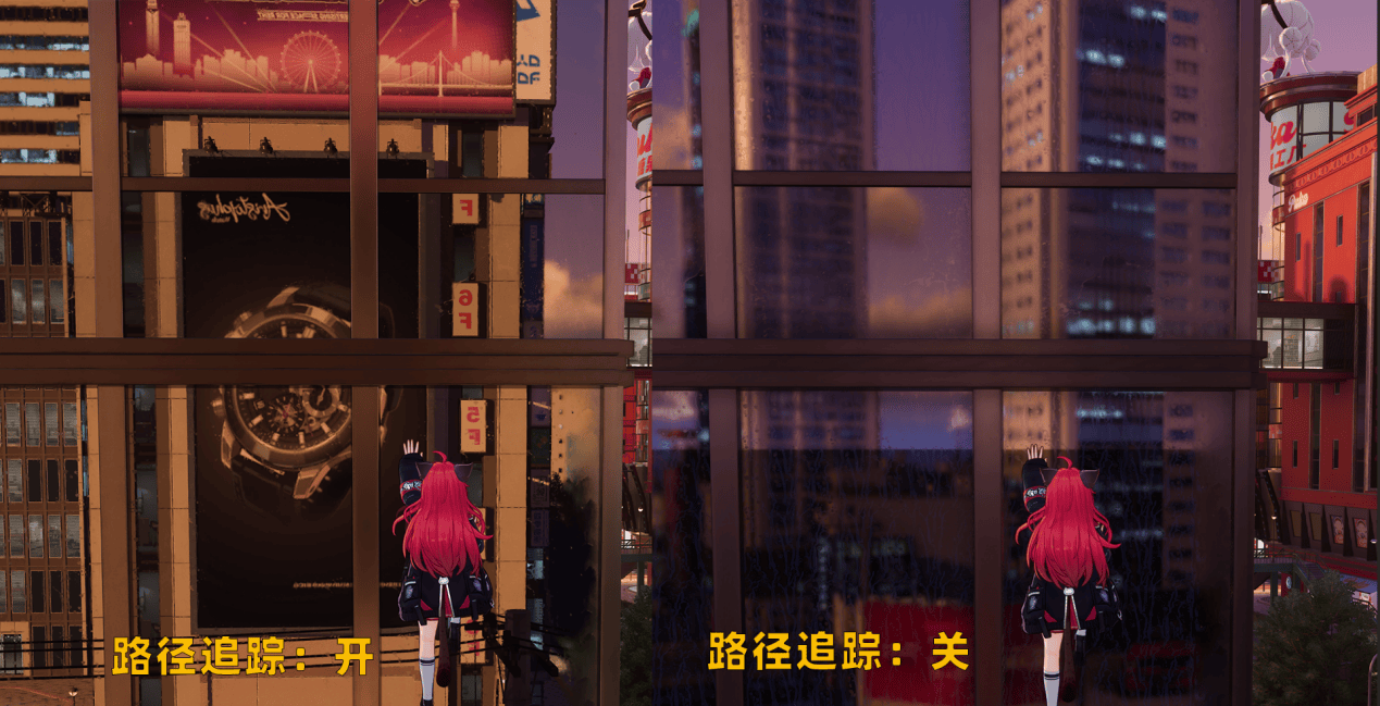 更重要的是《异环》还支持路径追踪,相比传统光线追踪,它模拟光线完整物理路径(发射、反射、折射、吸收),实现物理级精准全局光照。从我们的游戏截图可以看到,开启和关闭路径追踪的设置下,游戏体验完全是两个游戏。